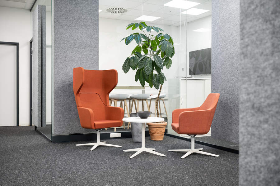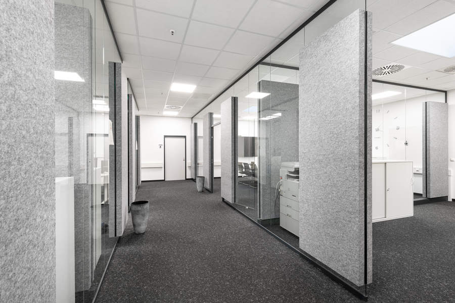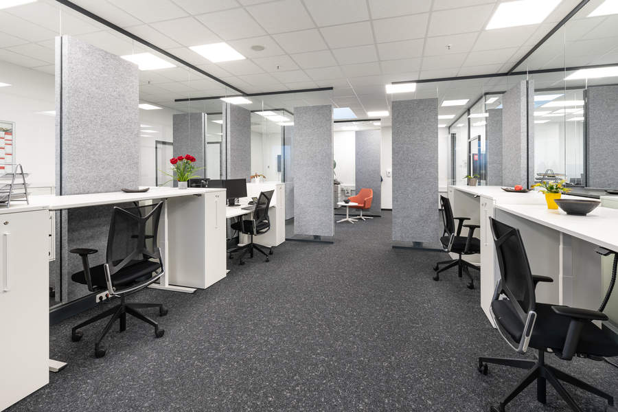 Die Raumaufteilung der bestehenden Bürofläche erfolgte mittels offenen Glastrennwandsystemen ohne Türen. Durch das intelligente Zusammenspiel von Durchgängen, Öffnungen und richtig platzierten Schallabsorbern wurde der offene Charakter des Büros beibehalten und gleichzeitig eine ruhigere und angenehmere Arbeitsumgebung geschaffen. Die Neugestaltung der Bürofläche vereinfacht die abteilungsübergreifende Teamzusammenarbeit und bietet gleichzeitig genügend Raum für Ruhe und Konzentration.