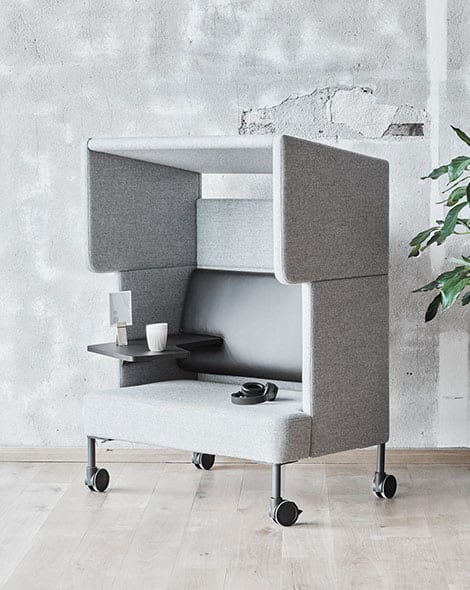 Komfortabler und äußerst flexibler Rückzugs- und Arbeitsbereich für bis zu vier Personen. Materialien wie Schaum und Vollpolster sorgen für schallabsorbierende Eigenschaften. Ob in sitzender oder stehender Position – maximaler Freiraum für ungestörtes Arbeiten oder Besprechungen. Egal wo.